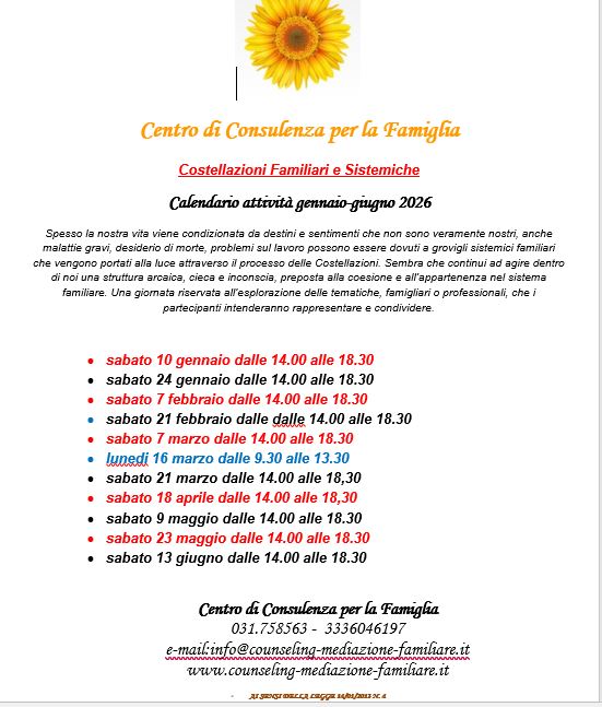 Il centro della Famiglia è lieto di presentare il calendario eventi per il periodo gennaio giugno 2026.